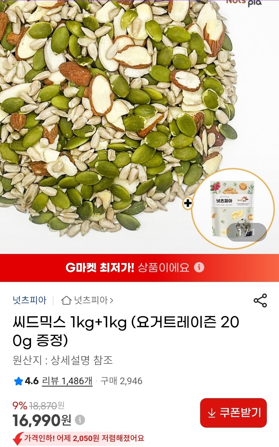 [지마켓]씨드믹스 2kg+요거트레이즌 200g증정(16,900원/무배)