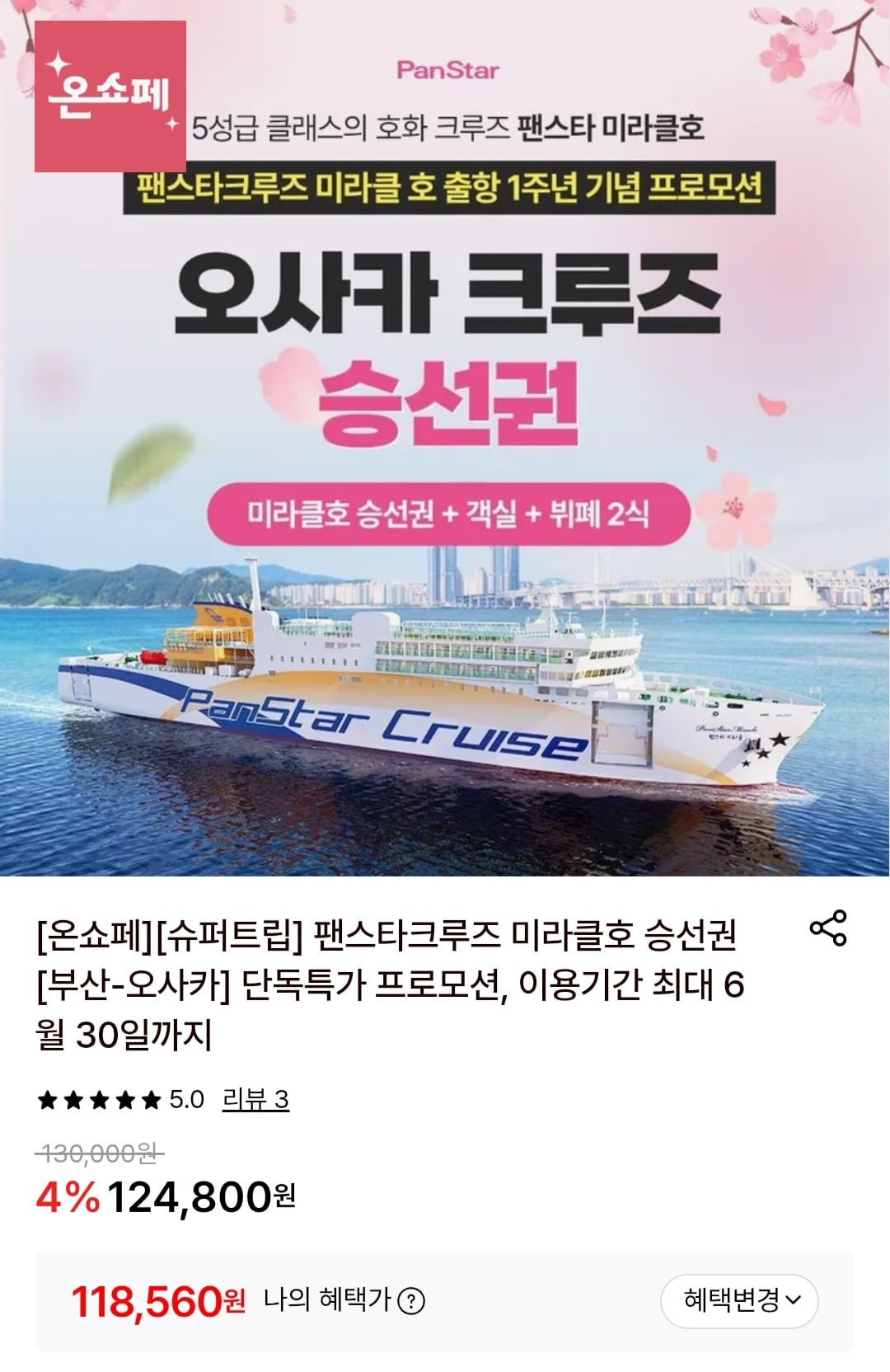 [롯데온]부산 오사카 편도/왕복 승선권 (롯데/국민 118,560원/무료)