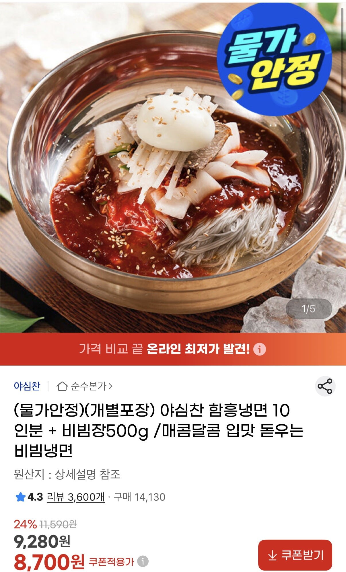 [지마켓]야심찬 함흥냉면 10인분+비빔장 500g (8,700원/무료)
