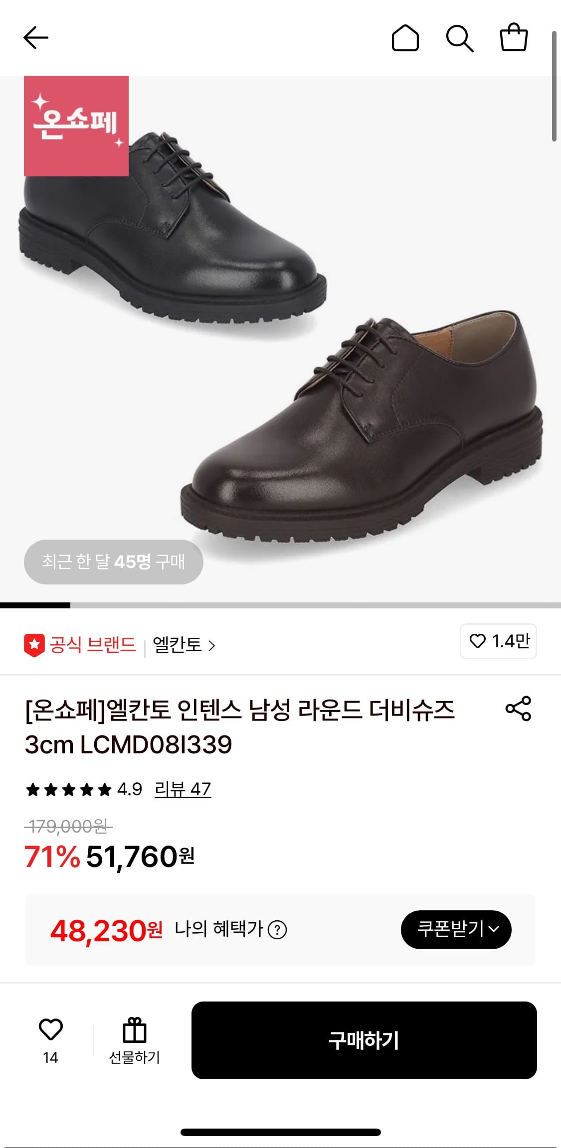 [롯데온]엘칸토 인텐스 남성 라운드 더비슈즈 3cm (48,230원/무료)