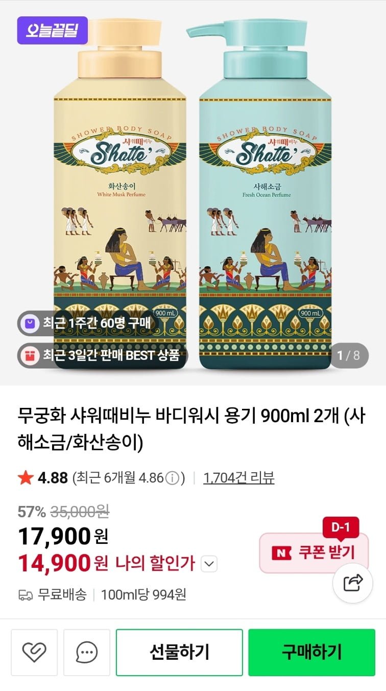 [네이버]샤워 때비누 바디워시 900ml 2개 (14,900원/무배)