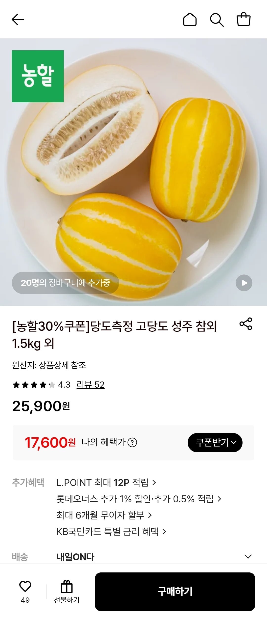[롯데온]고당도 성주 참외 1.5kg (17,600/무료)