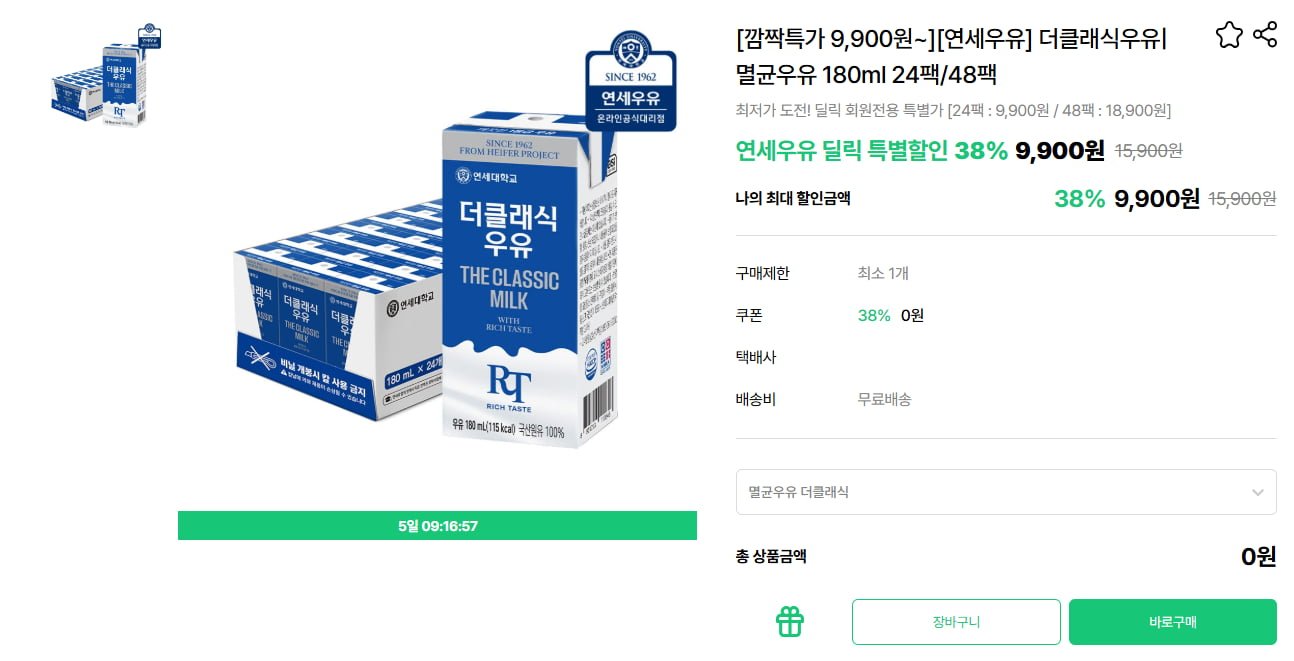 [딜릭]연세우유 더클래식우유 180ml 48팩 (18,900원/무료)