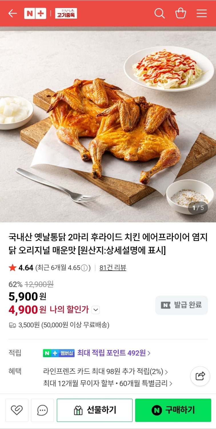 [네이버]국내산 에어프라이어 후라이드 염지닭 2마리 (4,900원/3,500원)