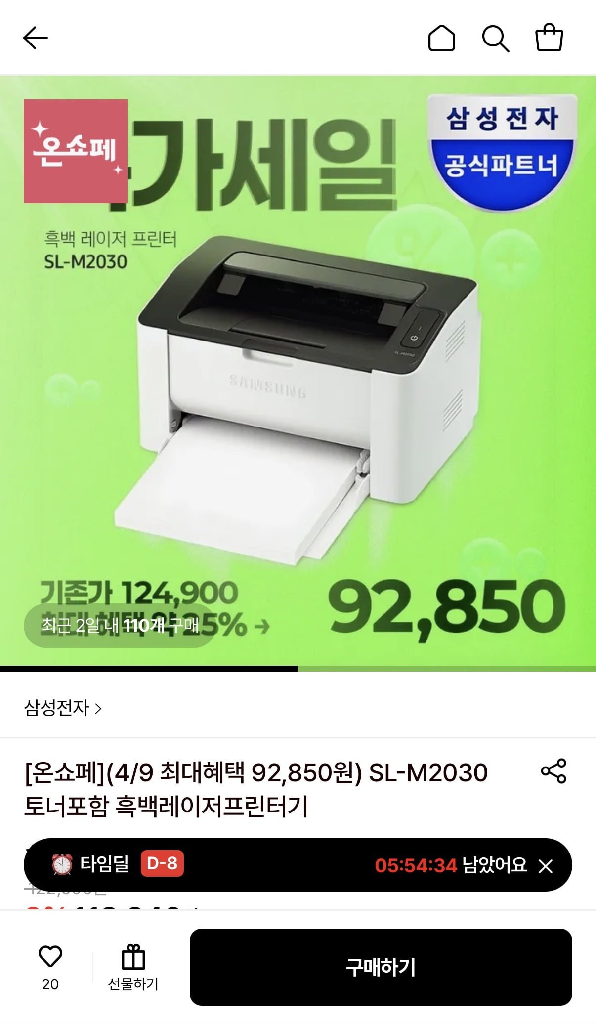 [롯데ON]삼성전자 흑백 레이저프린터 SL-M2030 (92,580원/무배)