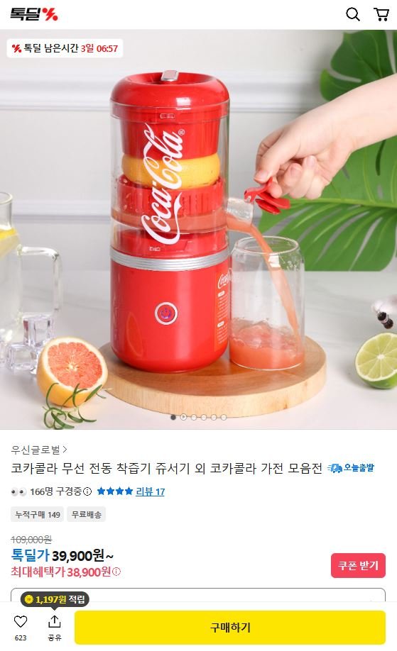 [카카오]코카콜라 무선 전동 착즙기 외 가전 모음전 (38,900원/무배)