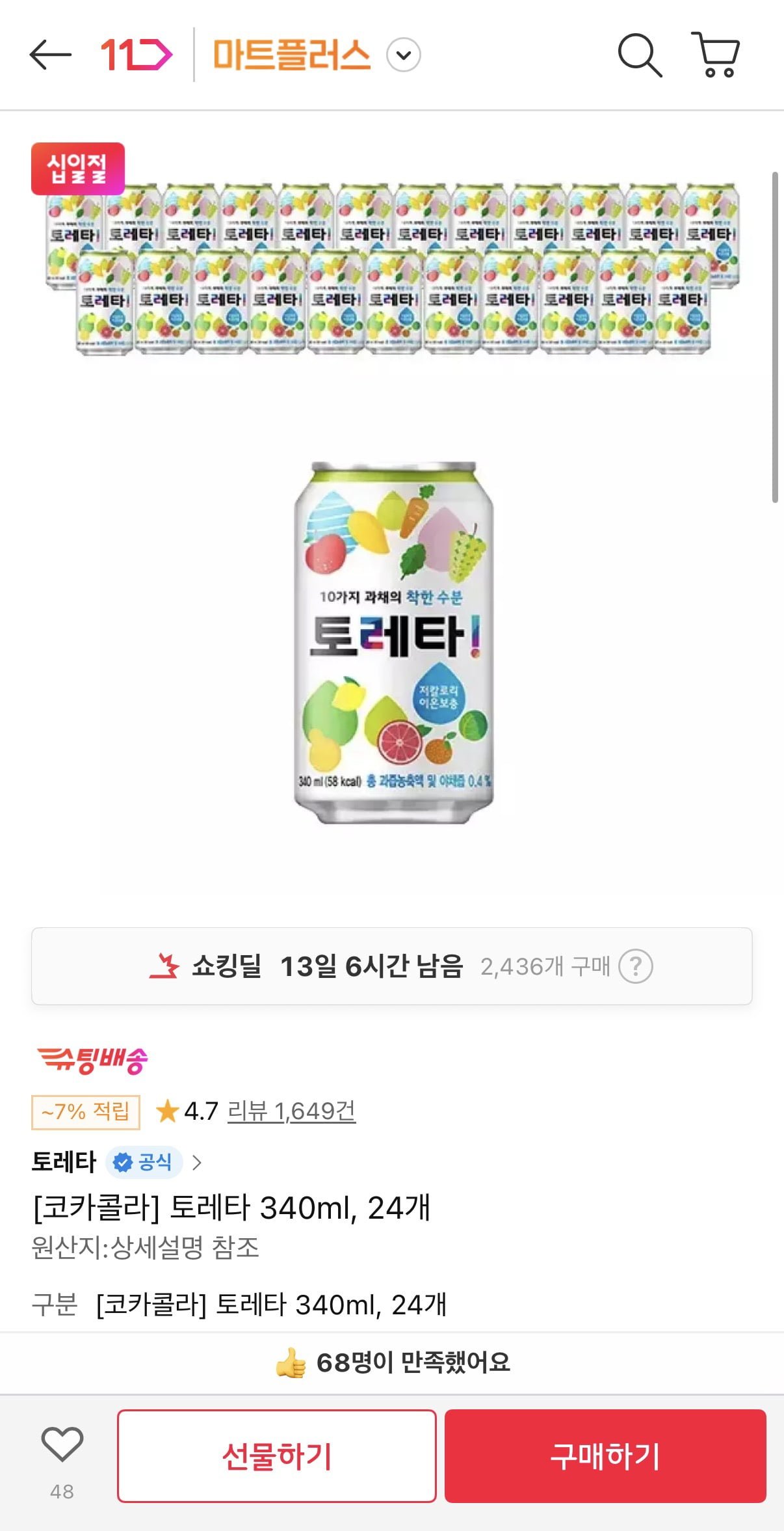 [11번가]토레타 340ml (티멤10,070원/무료) - 딜모아