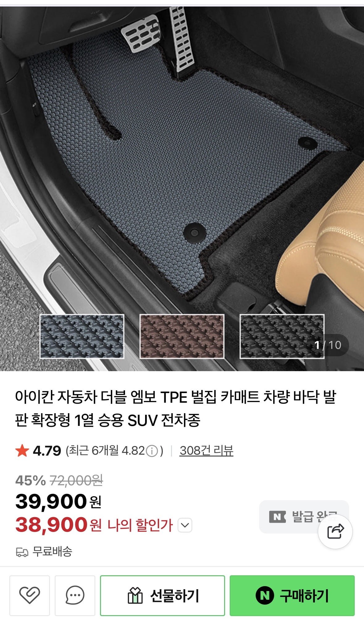 [네이버]아이칸 더블 엠보 TPE 벌집카매트 자동차매트 (39,900원/무료배송)