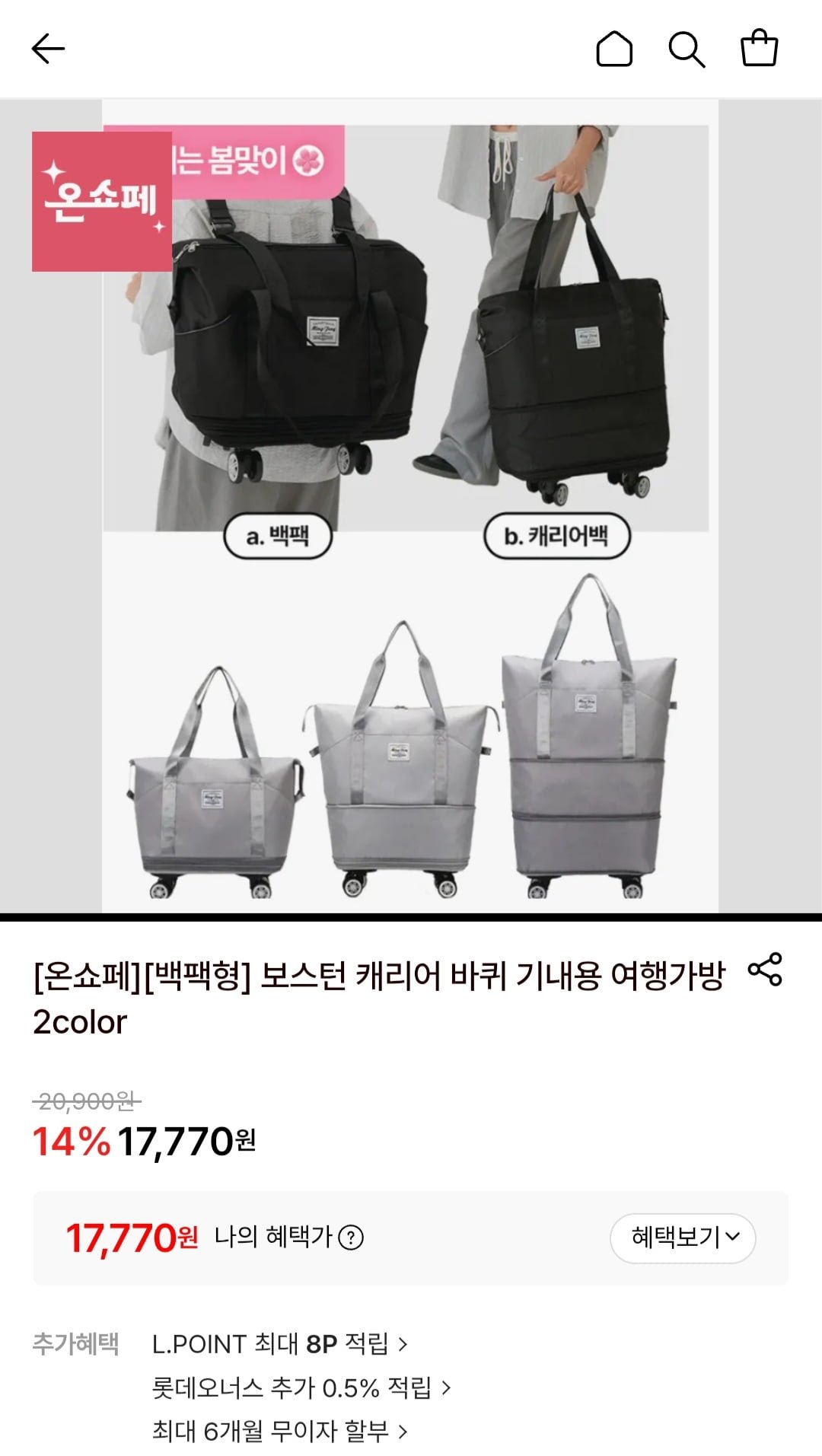 [롯데온]보스턴 캐리어 바퀴 기내용 여행가방 2color (17,770원/무료)