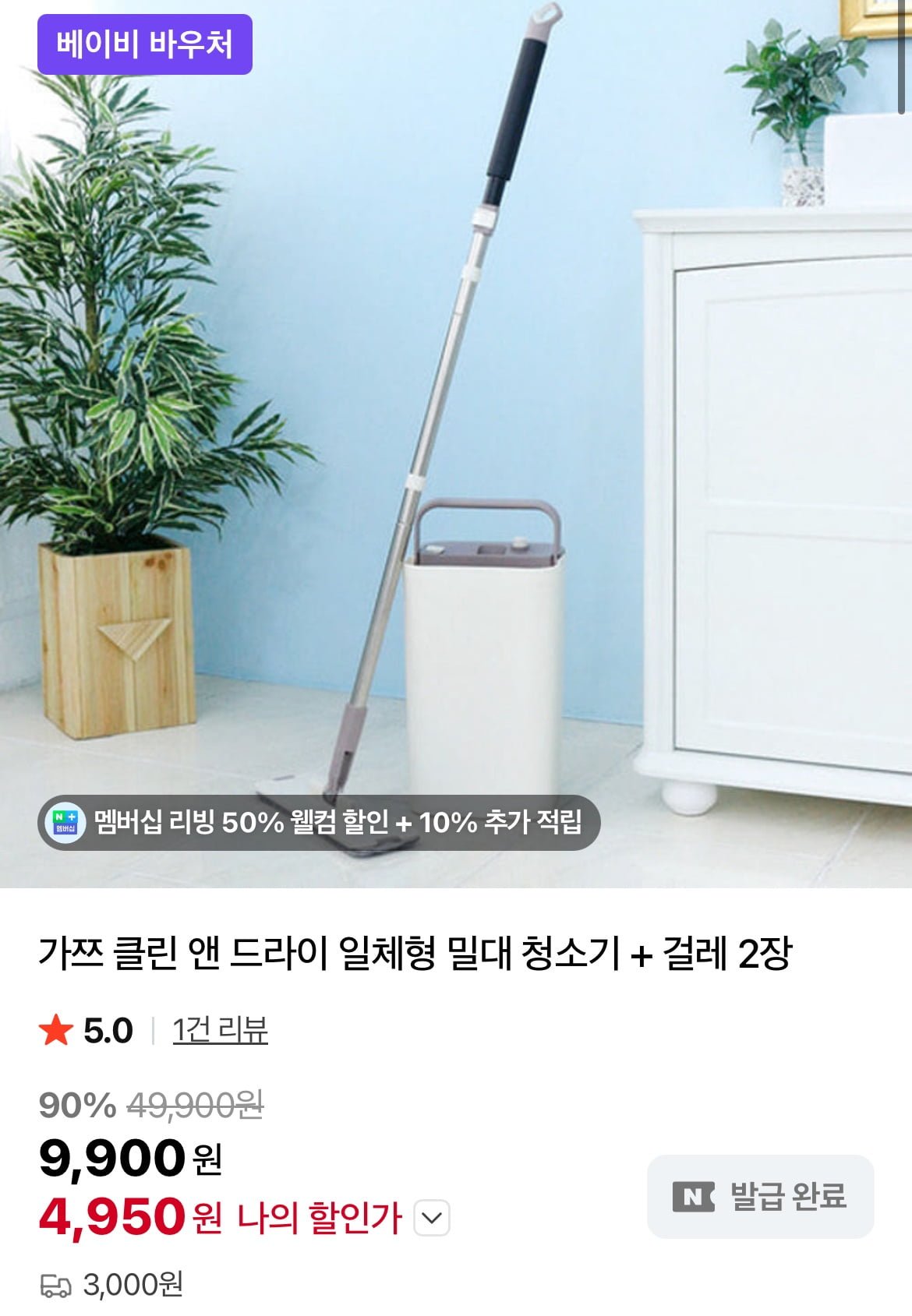 [네이버]클린 앤 드라이 일체형 밀대 청소기 + 걸레 2장(4,950원/3000원)