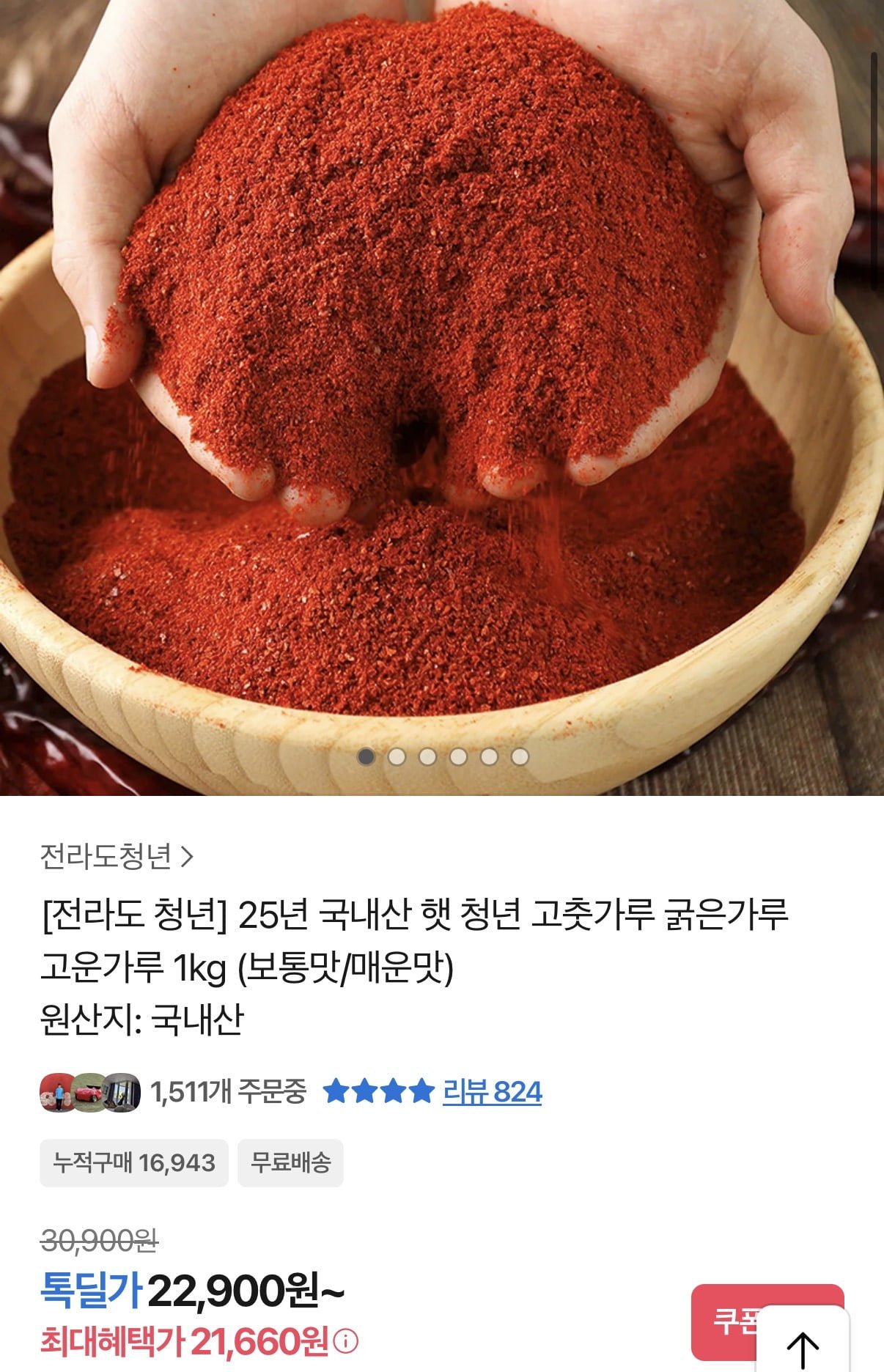[톡딜]25년 국내산 햇 고춧가루 굵은가루 1kg (21,660원/무료) - 딜모아