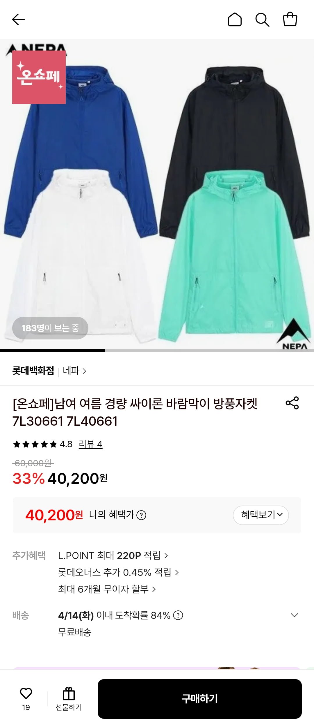 [롯데온]네파 경량 싸이론 바람막이 방풍자켓 (40,200원/무료)