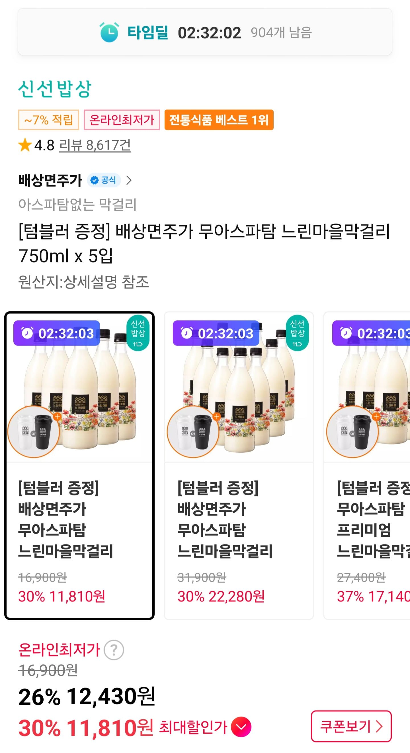 [11번가][텀블러 증정] 느린마을막걸리 750ml 5입 (12,430원/무료)
