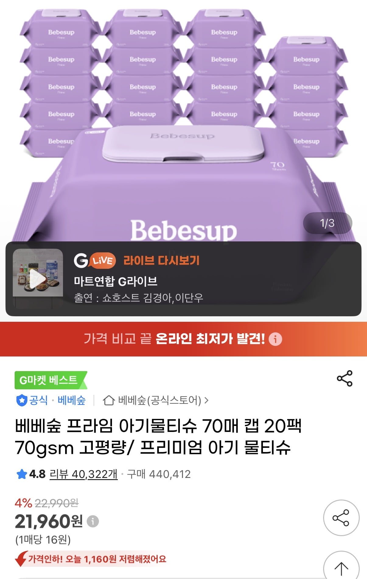 [지마켓]베베숲 프라임 아기물티슈 70매 캡 20팩 70gsm 고평량/ 프리미엄 아기 물티슈(21,960원/무료배송)