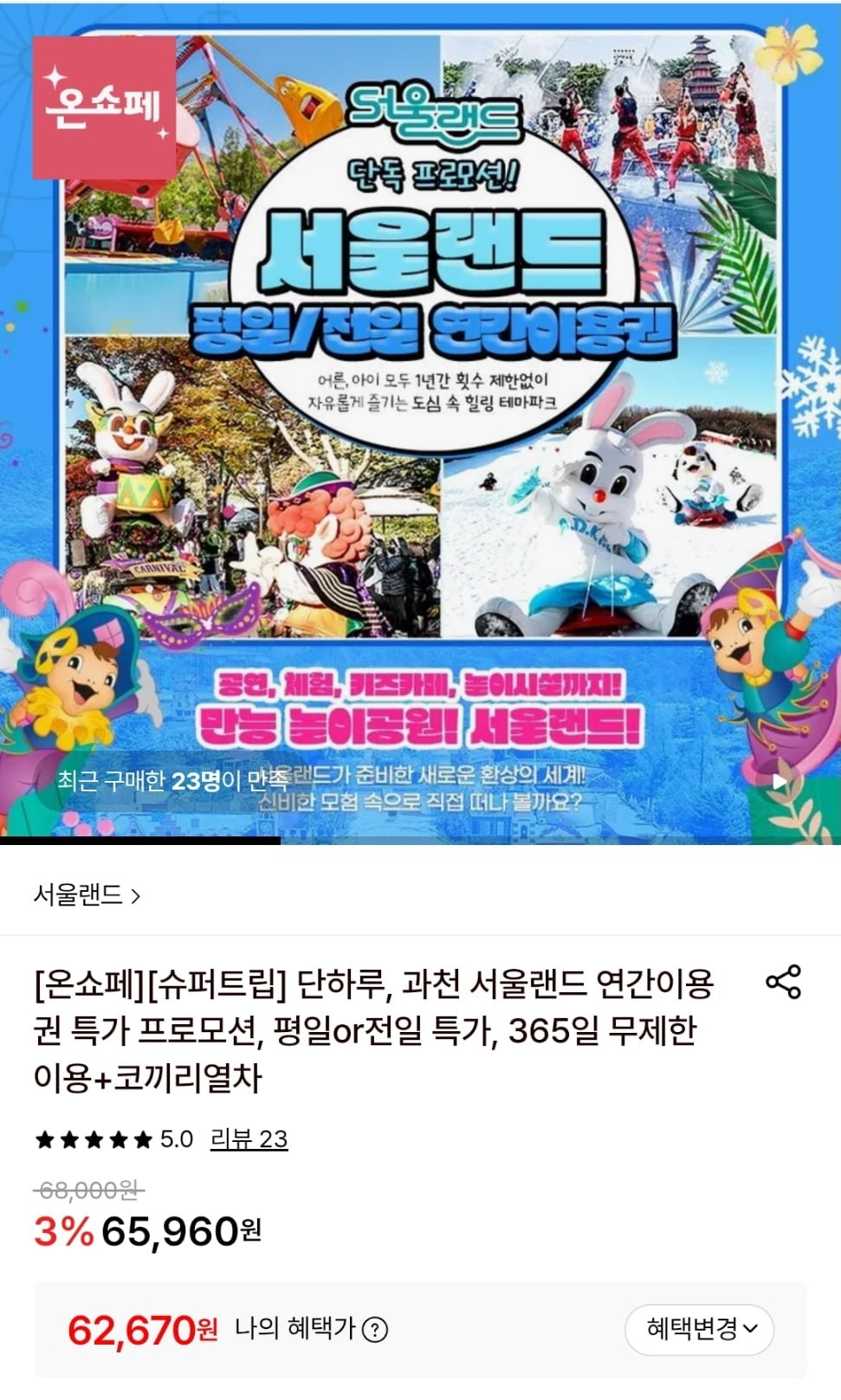 [롯데온]과천 서울랜드 소인/대인 평일 연간이용권 (롯데/국민 62,670원~/무료)