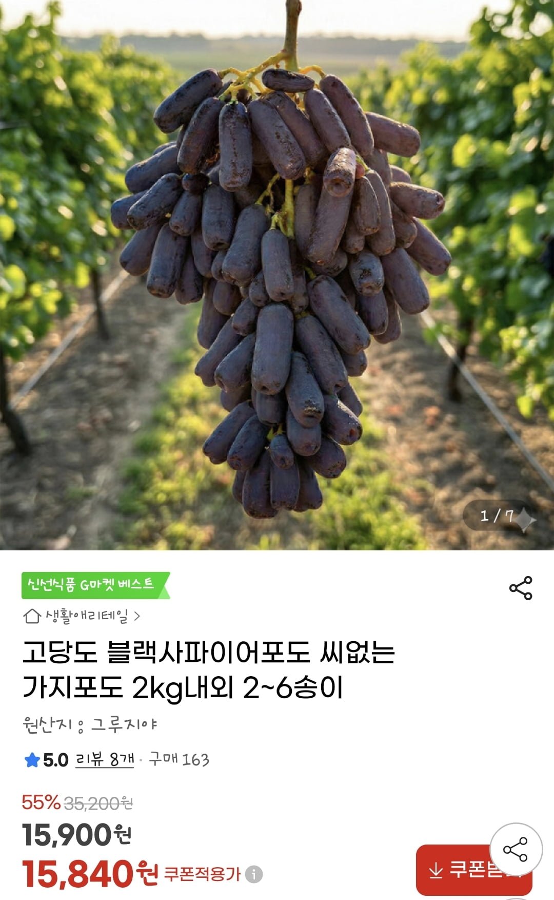 [지마켓]16브릭스 고당도 블랙 사파이어포도 2kg (15,840원/무료) - 딜모아