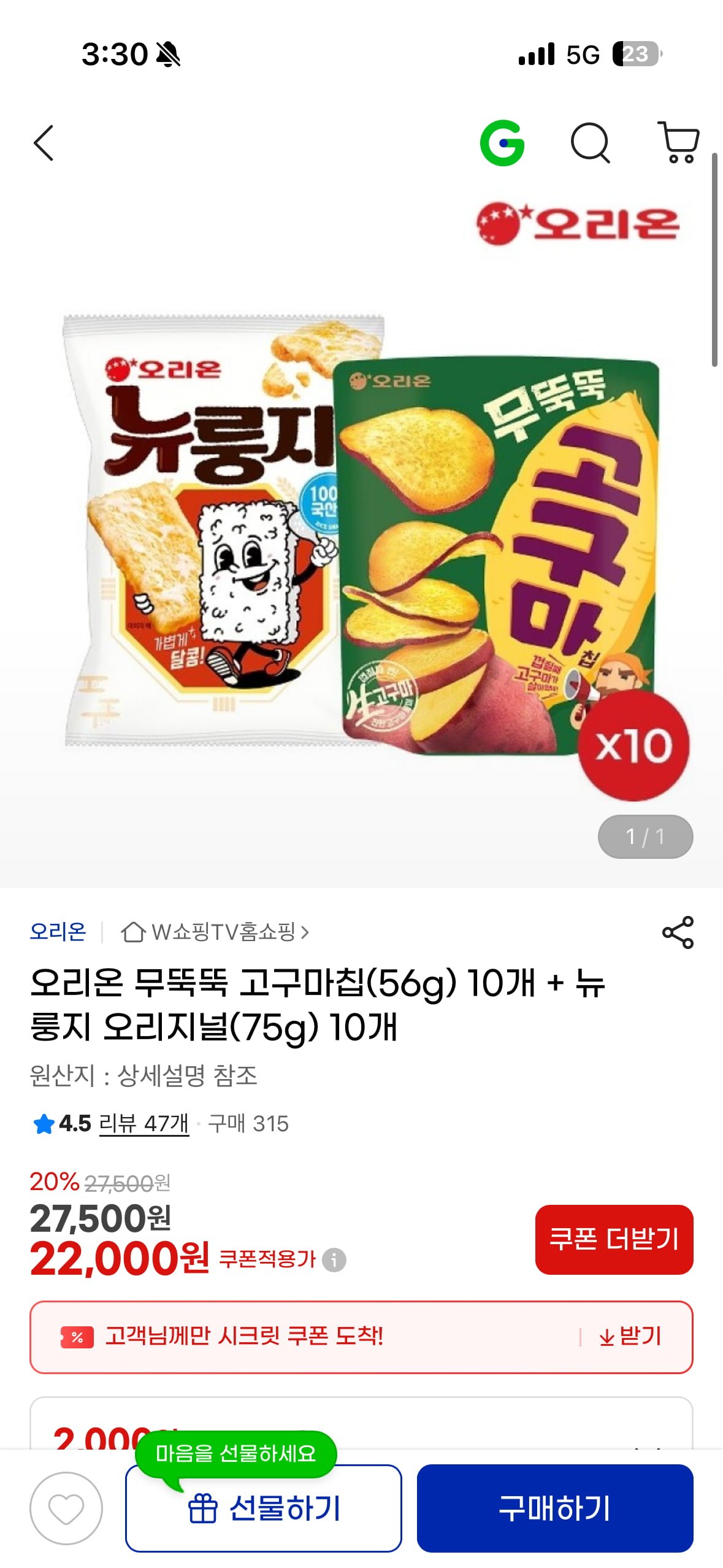 [지마켓]오리온 무뚝뚝 고구마칩(56g) 10개 + 뉴룽지 오리지널(75g) 10개(22,000원/무배)