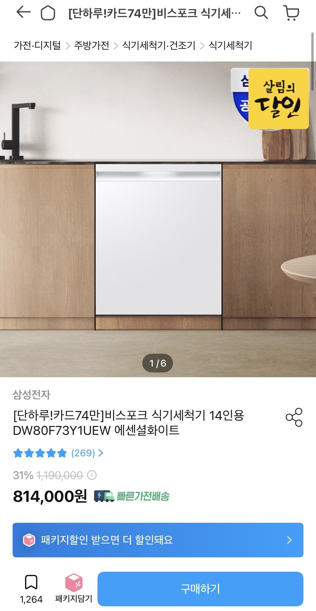 [오늘의집]비스포크 식기세척기 14인용 DW80F73Y1UEW 에센셜화이트 (748,880원/무배)