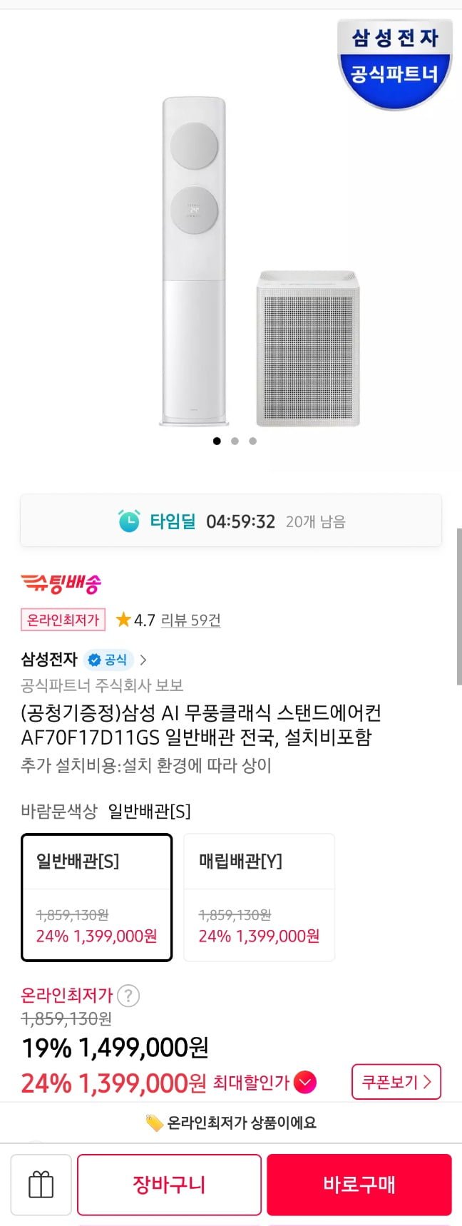 [11번가]삼성 무풍클래식 에어컨 스탠드형 + 공기청정기 증정 (1,399,000원/무료) - 딜모아