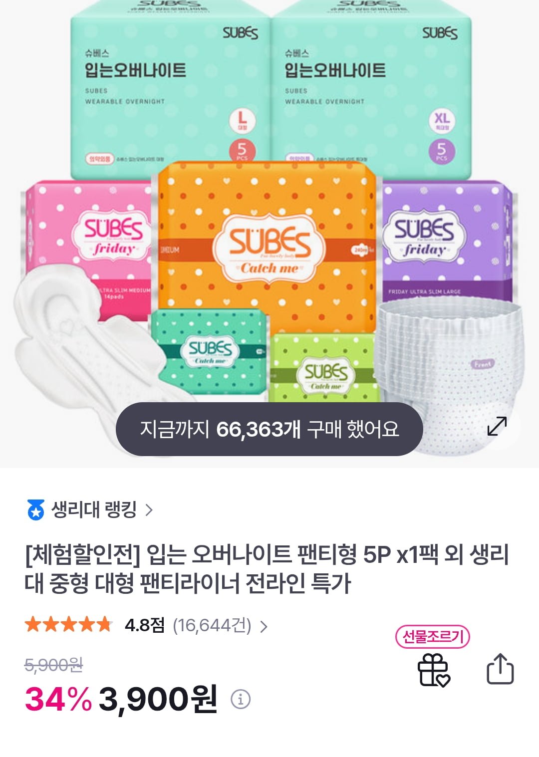[GS샵]체험할인전 입는 오버나이트 팬티형 5P x1팩 외 생리대 중형 대형 팬티라이너 전라인 특가 (3,900원/무료) - 딜모아