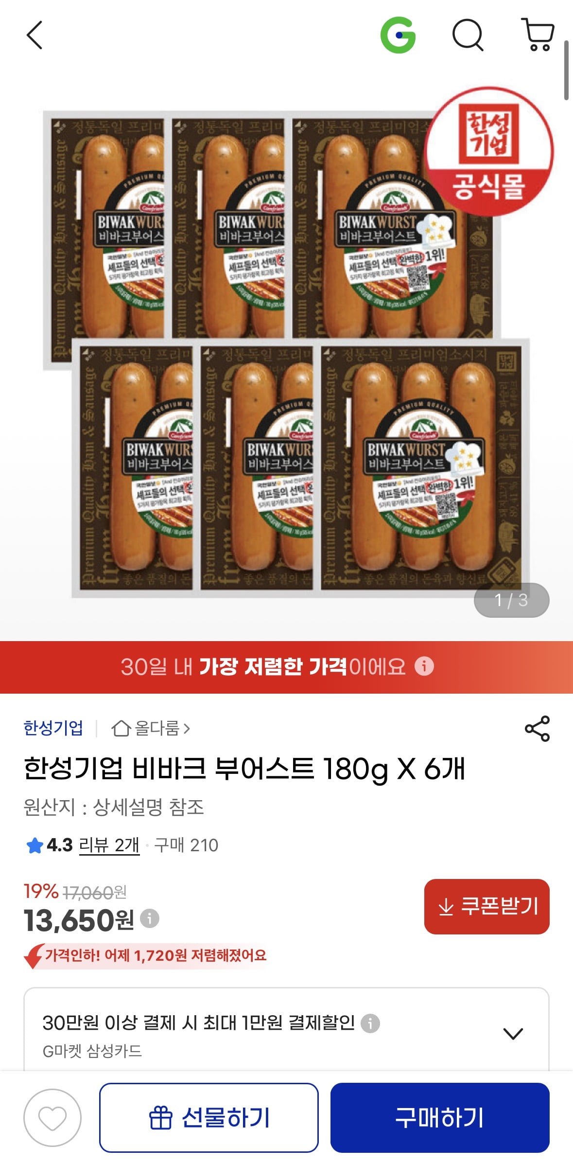 [지마켓]비바크 부어스트 180g 6개 (13,650원/무료)