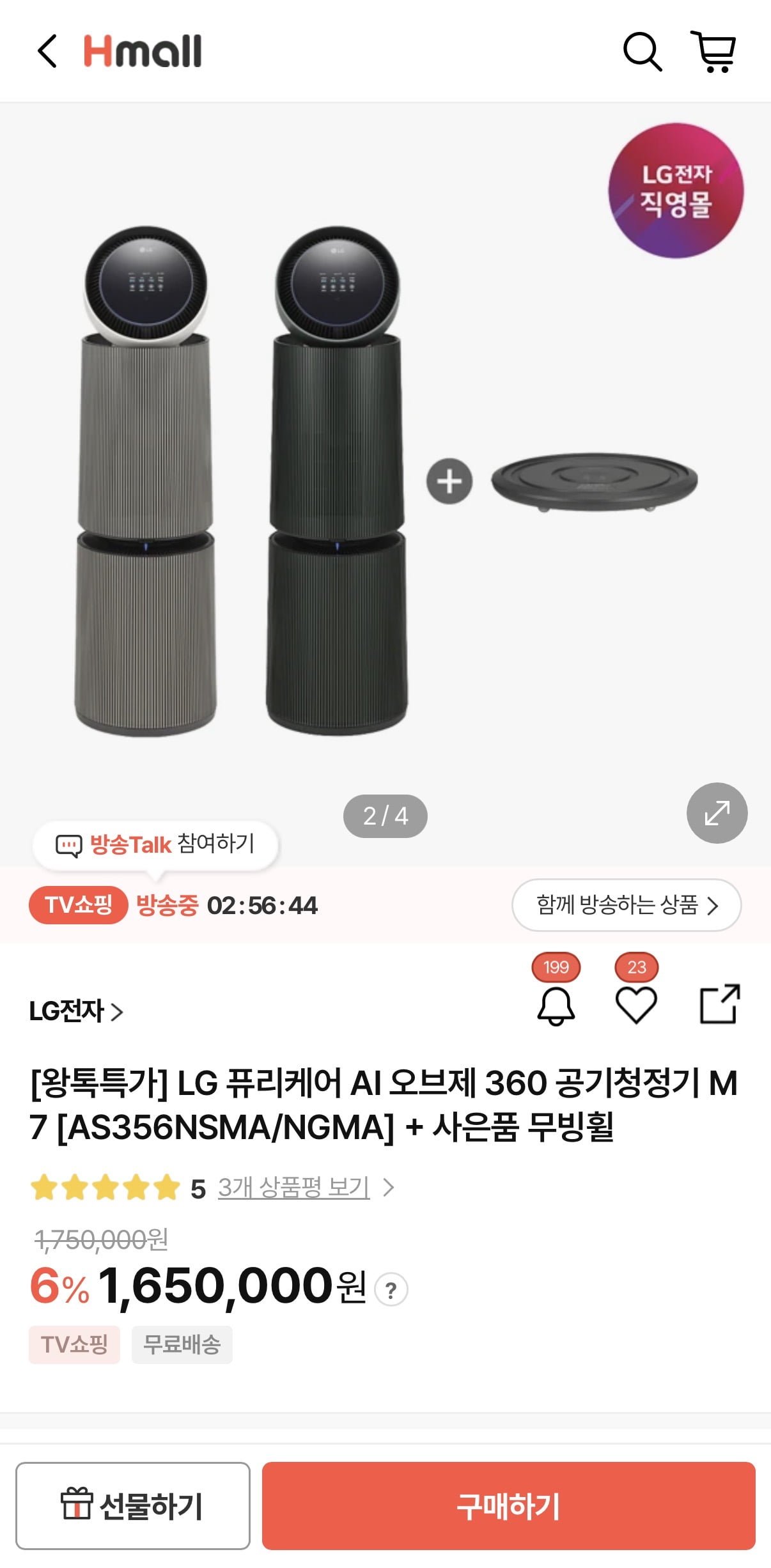 [H몰]LG 퓨리케어 AI 오브제 360 공기청정기 M7 + 무빙휠증정(1,567,500원/무배)