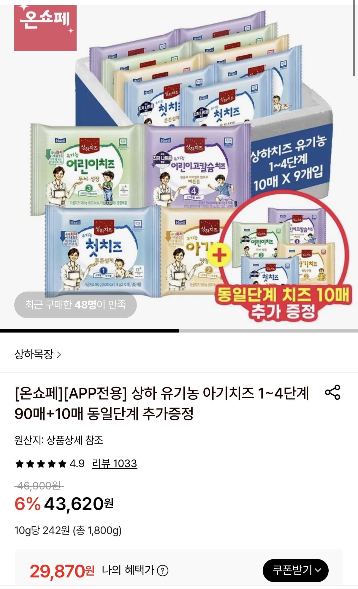 [롯데온]상하 유기농 아기치즈 1~4단계 90매 (29,870원/무료)