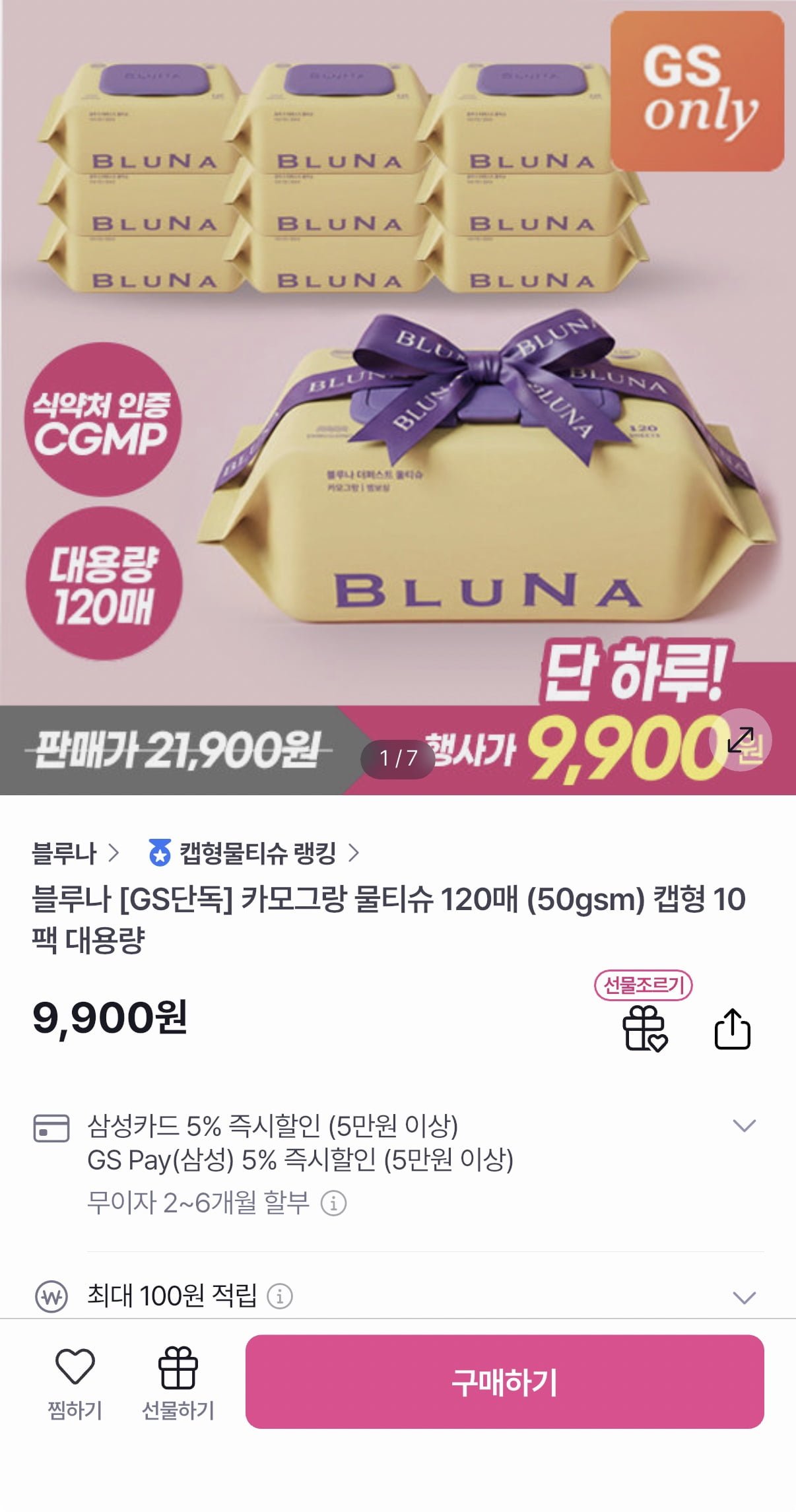 [GS샵]블루나 카모그랑 물티슈 120매 10팩 (9,900원/무료)