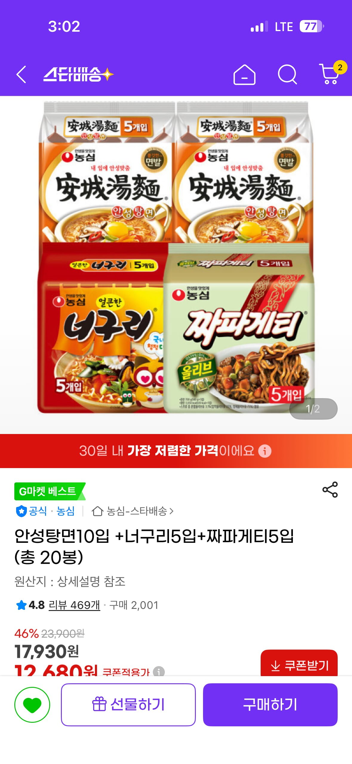 [지마켓]안성탕면2+너구리1+짜파게티1 (12,680원/무료)