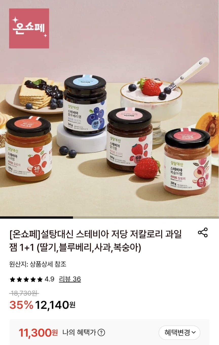 [롯데온]설탕대신 스테비아 저당 저칼로리 과일잼 1+1 (11,300원/무료)
