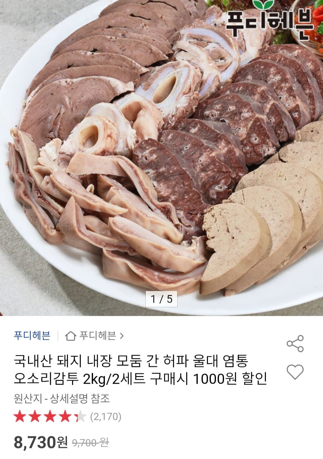 [옥션]국내산 돼지 내장 모둠 간 허파 울대 염통 오소리감투 2kg (8,730원/무배)