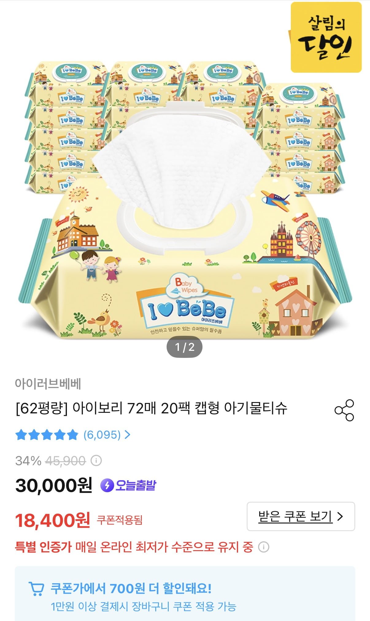 [오늘의집]아이러브베베 아이보리 캡형 물티슈 72매X20팩 (15,930원/무료)