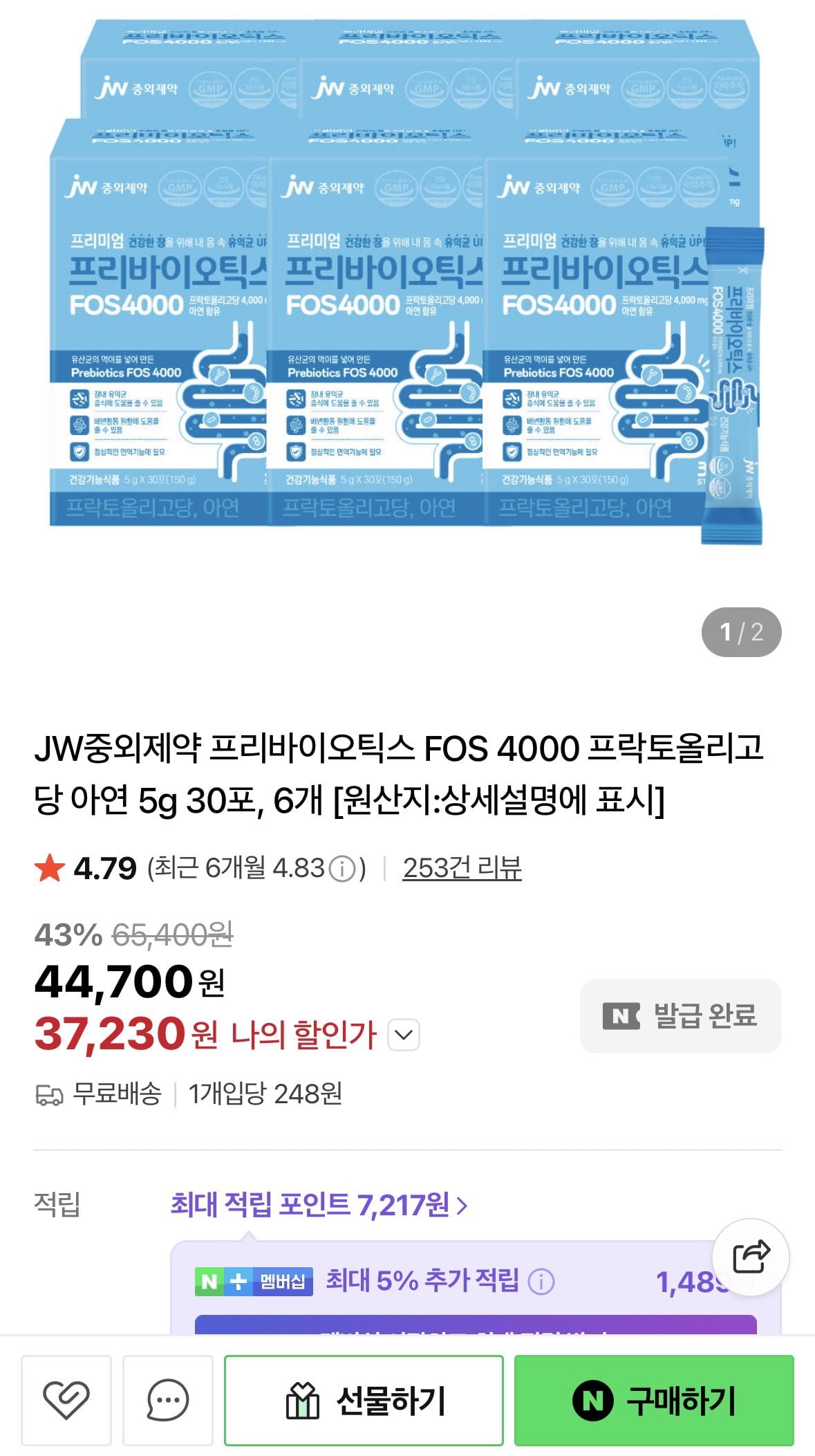 [네이버]JW중외제약 프리바이오틱스 FOS 4000 6박스 (37,230원/무배)