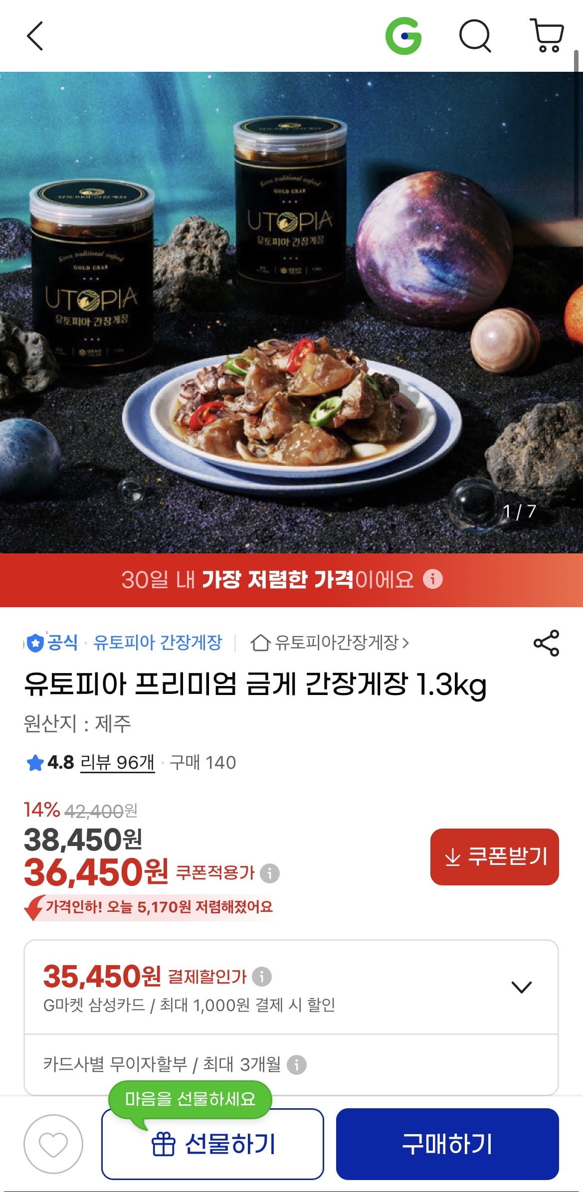 [지마켓]유토피아 프리미엄 제주 금게 간장게장 1.3kg(36,450원/무배)