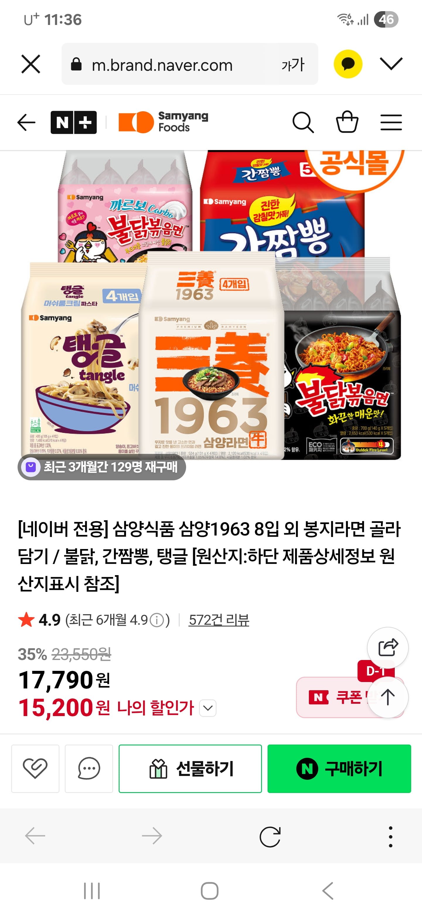 [네이버]삼양1963 외 봉지라면 골라담기/ 불닭,까르보 (15,210원/무료배송)