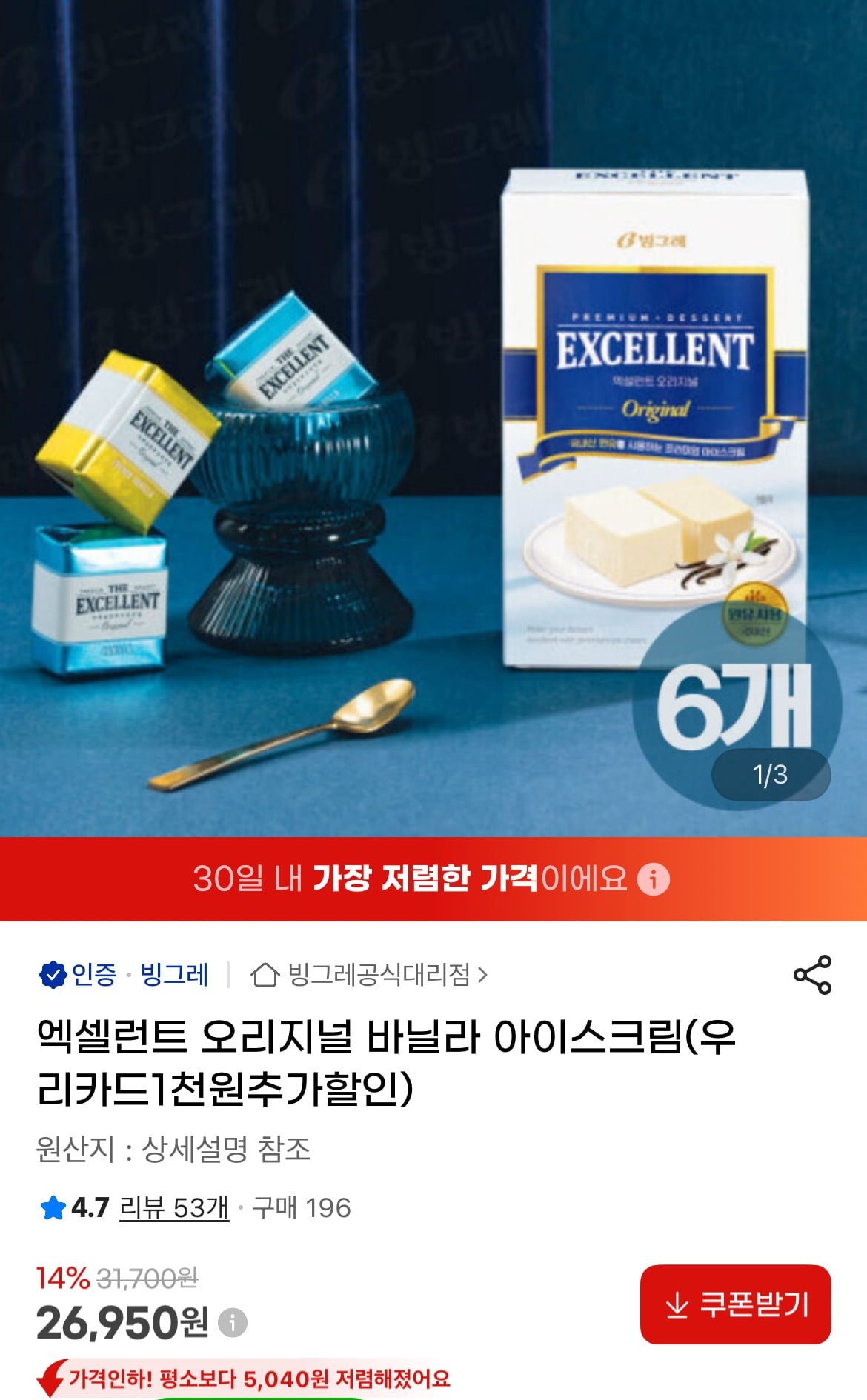[지마켓]엑셀런트 오리지널 바닐라 아이스크림 6개(26,950원/무료)