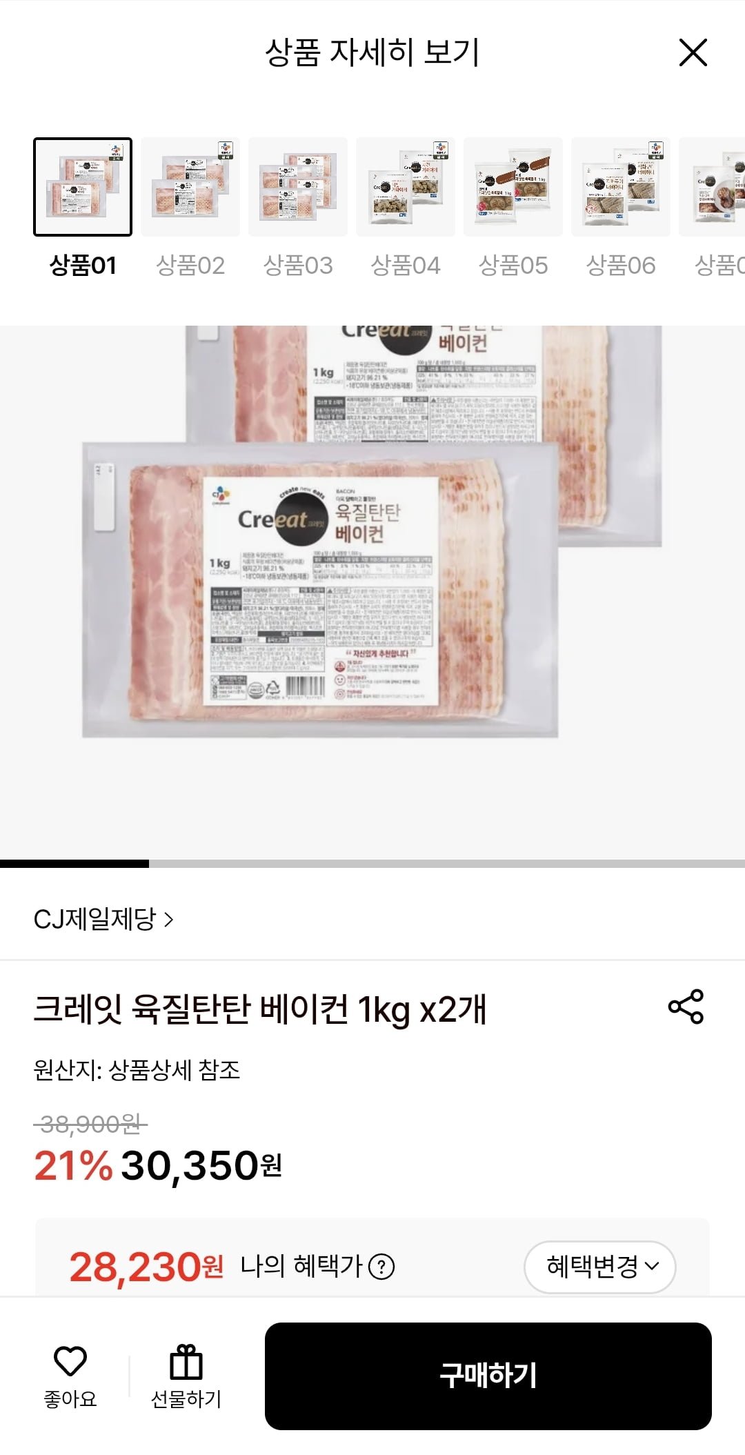 [롯데온]CJ 크레잇 오리지널 베이컨 1kg 2개 (28,230원/무료)