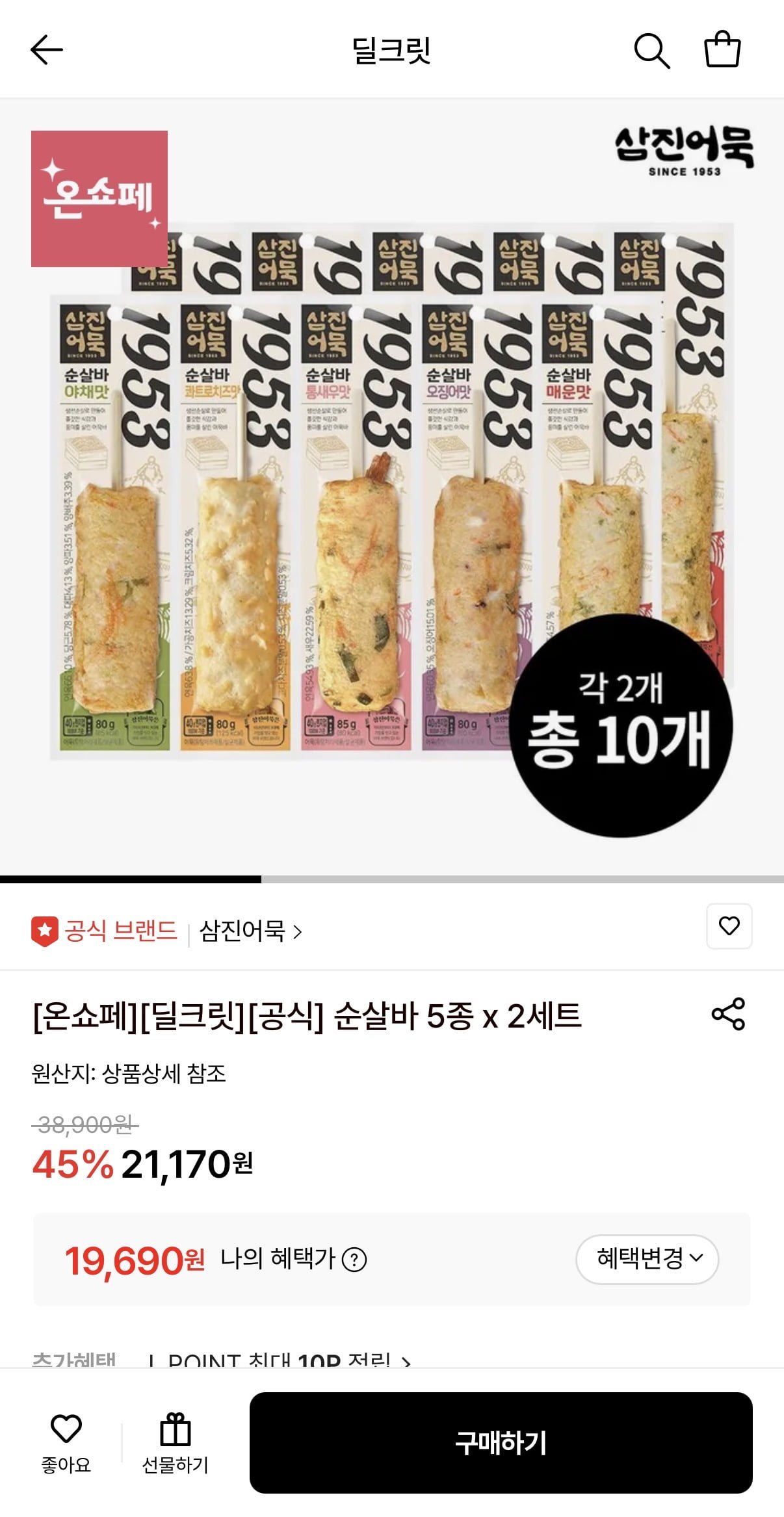 [롯데온]삼진어묵 순살바 5종 2세트 총20개 (19,690원/무료) - 딜모아