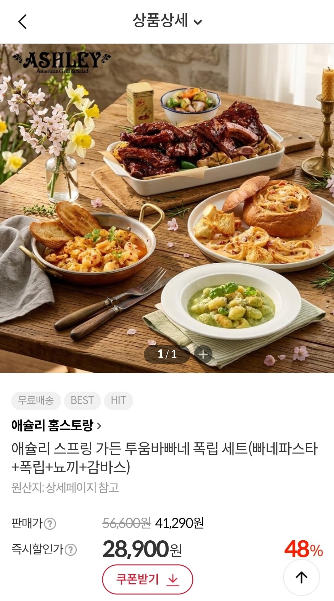 [이랜드몰]애슐리 스프링 가든 투움바빠네 폭립 세트 (28,900원/무료)