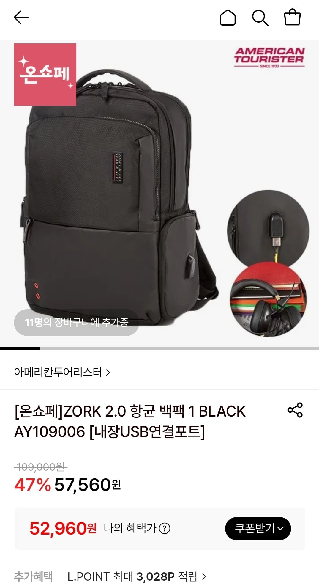 [롯데온]아메리칸투어리스터 항균 백팩 (52,960원/무료)