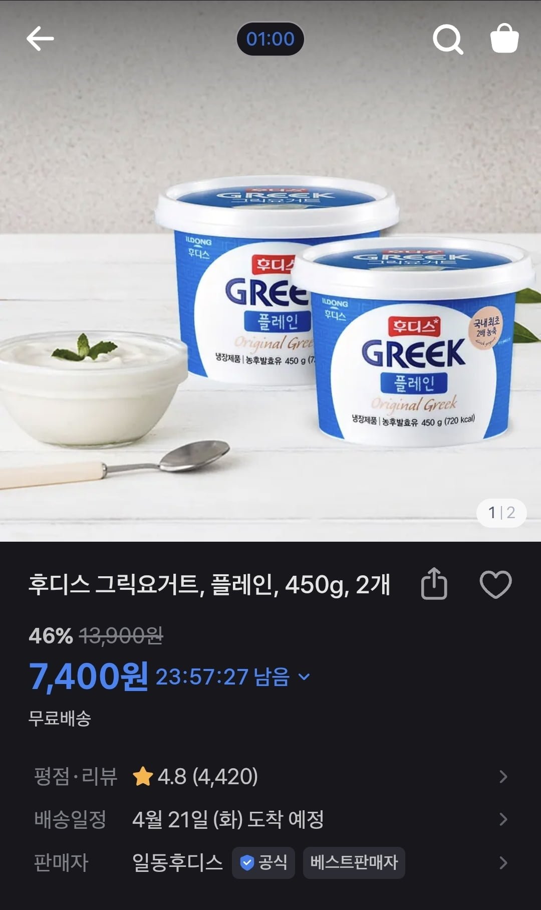 [토스]후디스 그릭요거트 플레인 450g 2개 (7,400원/무료)