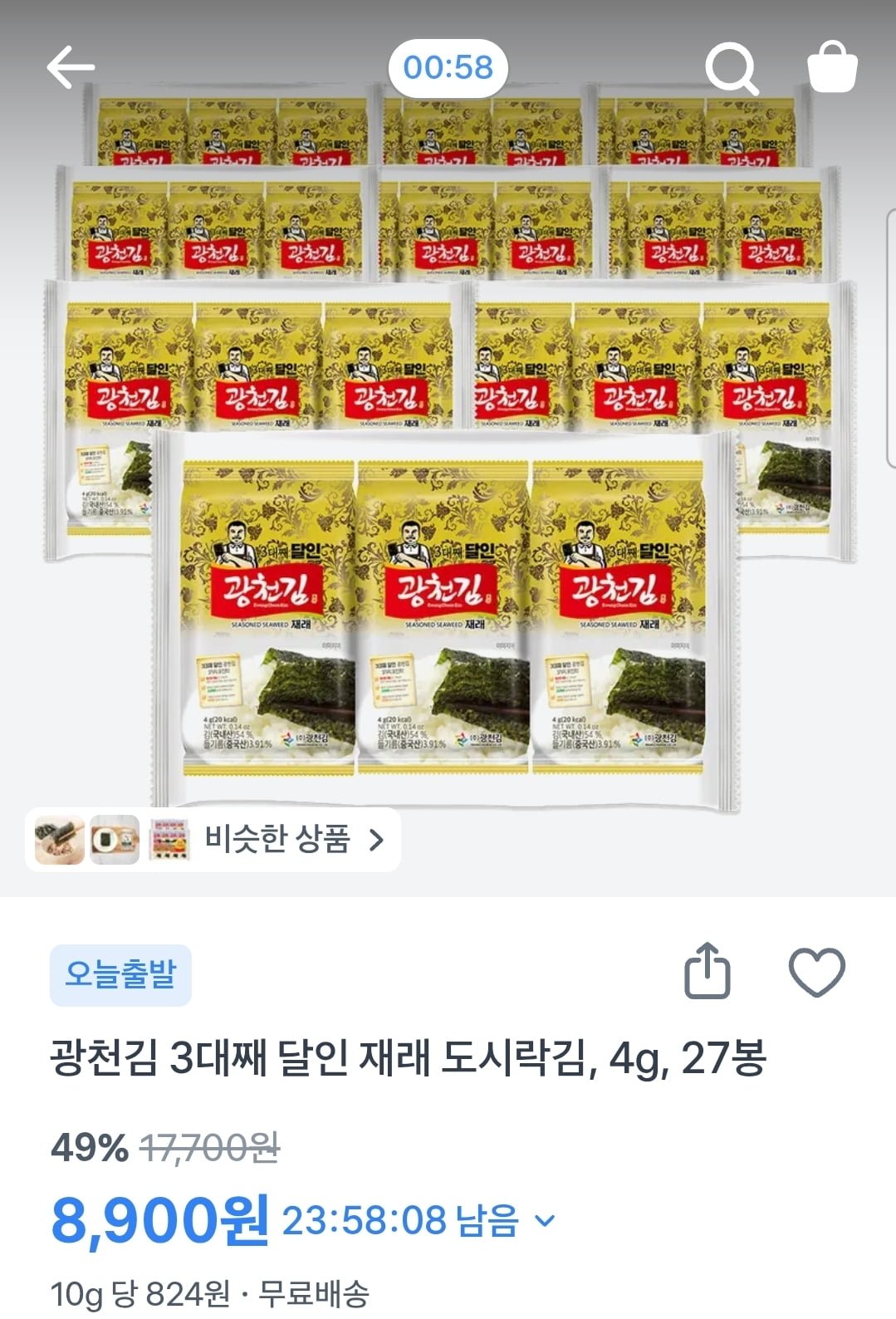 [토스]광천김 3대째 달인 재래 도시락김 4g 27봉 (8,900원/무료)