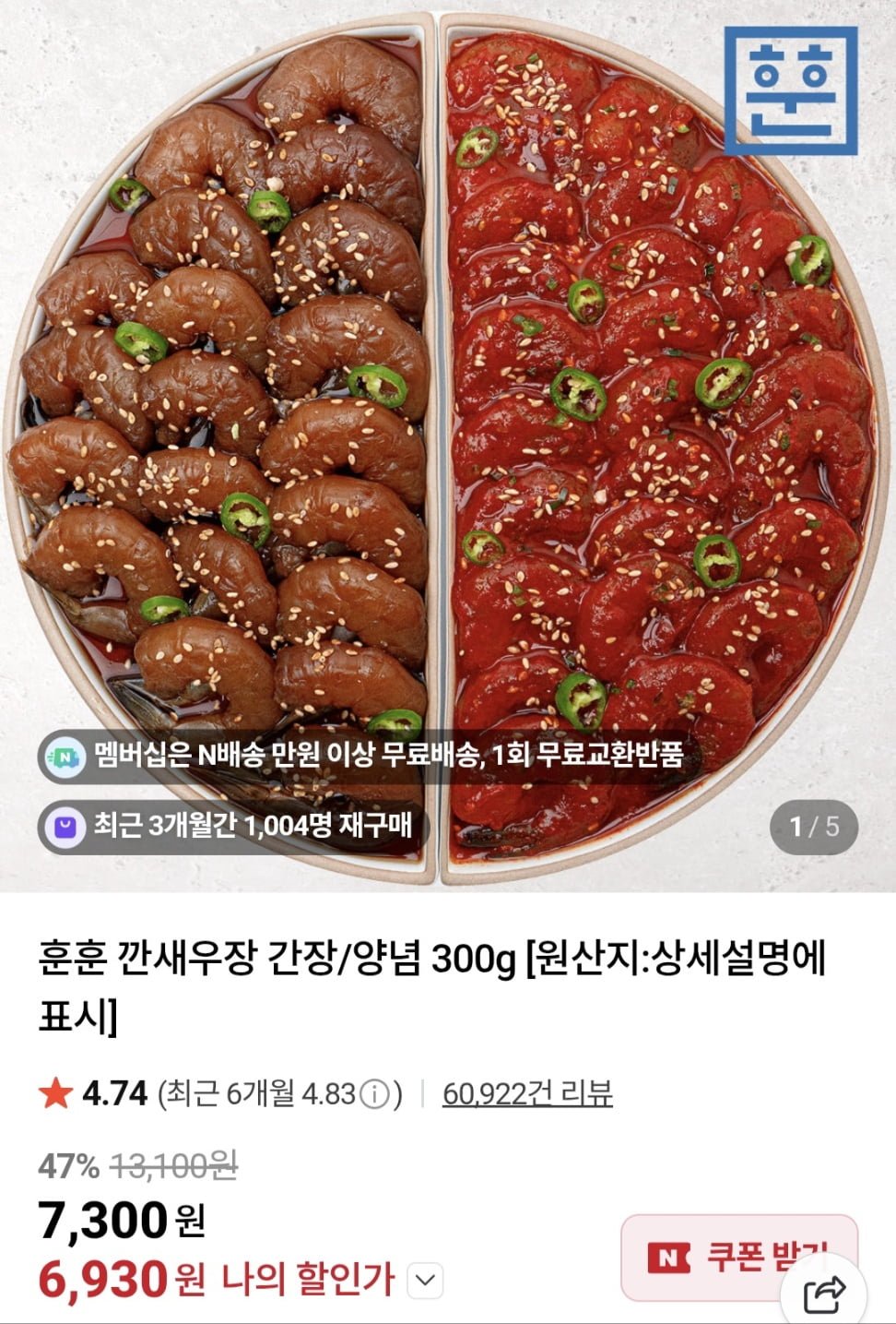 [네이버]훈훈 깐새우장 간장/양념 300g (6,930원 네멤무배)