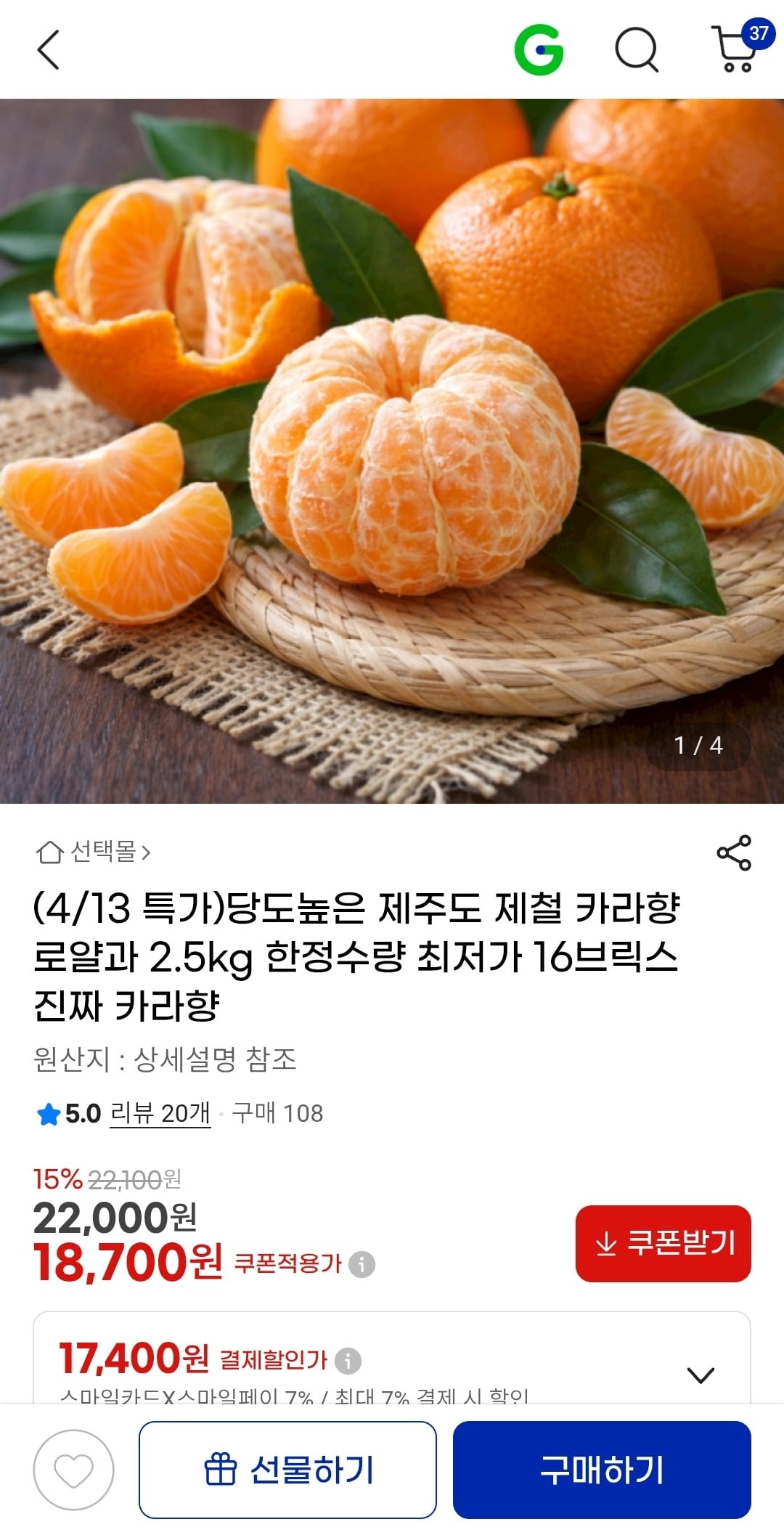 [지마켓]제주도 제철 카라향 로얄과 2.5kg(18,700원/무료)