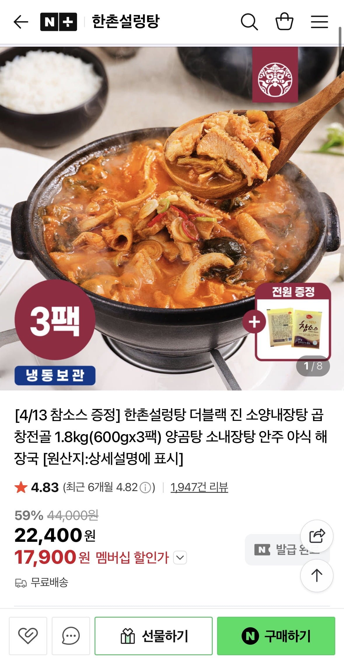 [네이버]한촌설렁탕 더블랙 프리미엄 진 소양내장탕 곱창전골 600g 3팩 (17,900원/무료배송) - 딜모아