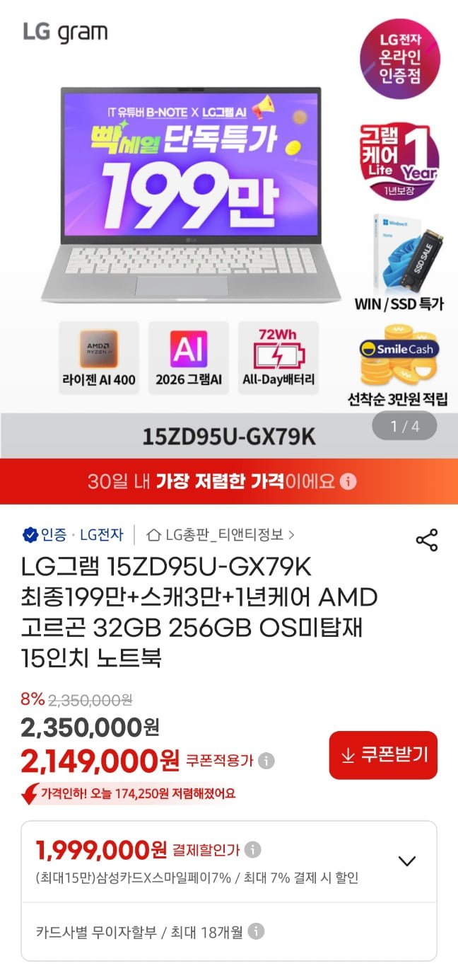 [G마켓]LG전자 그램 2026 15ZD95U-GX79K 램 32GB(1,999,000원/무료)