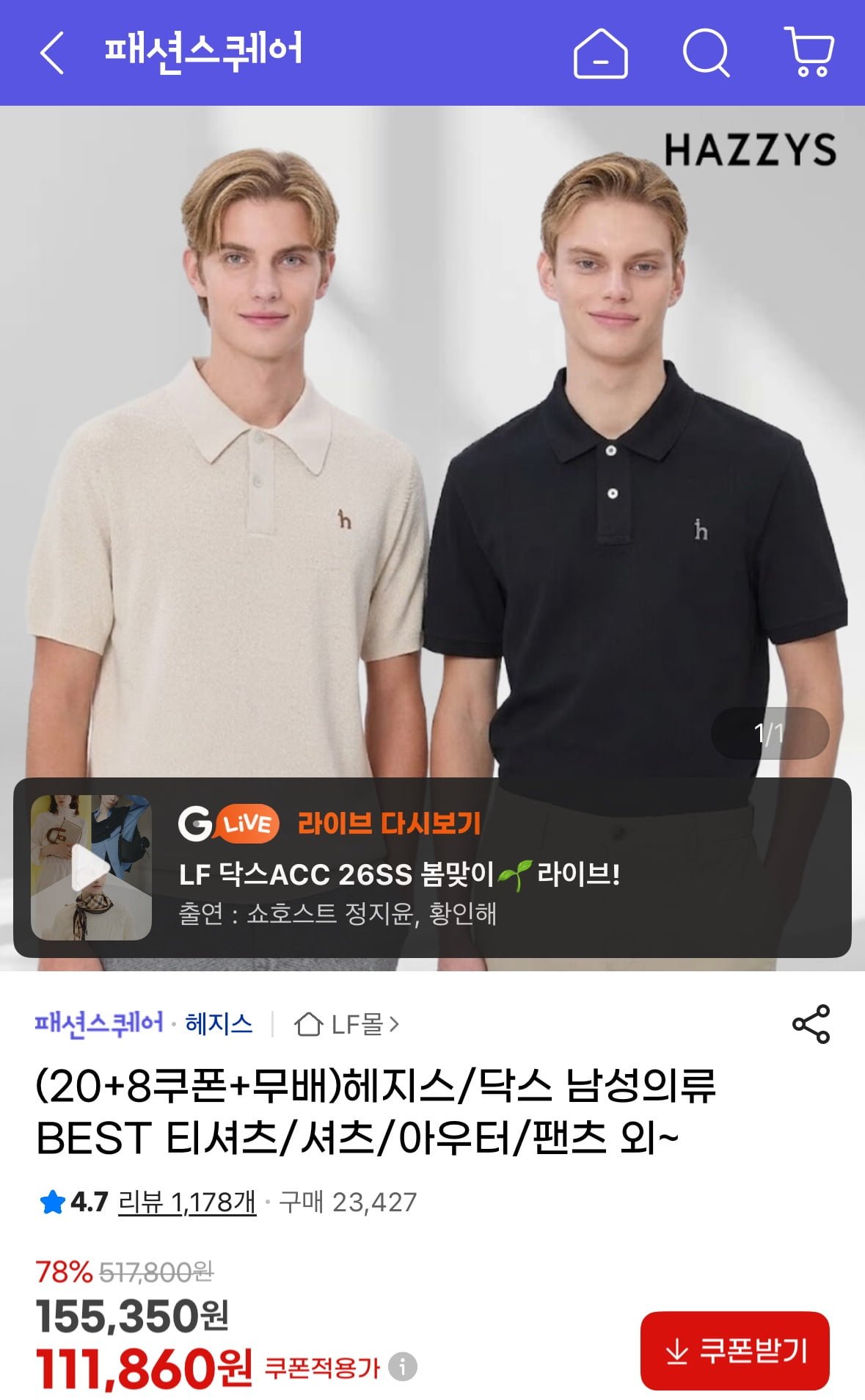 [지마켓]헤지스 멜란지 면 반팔티셔츠 (39,820원/무료)