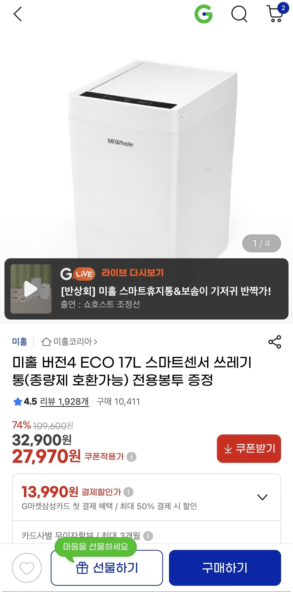 [지마켓]미홀 버전4 ECO 17L 스마트센서 쓰레기통(종량제 호환가능) 전용봉투 증정 27,970 - 딜모아