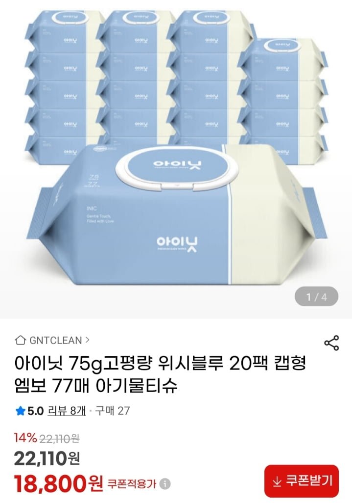[지마켓]아이닛 위시블루 75g 아기물티슈 77매 20개 (19,900원/무배)