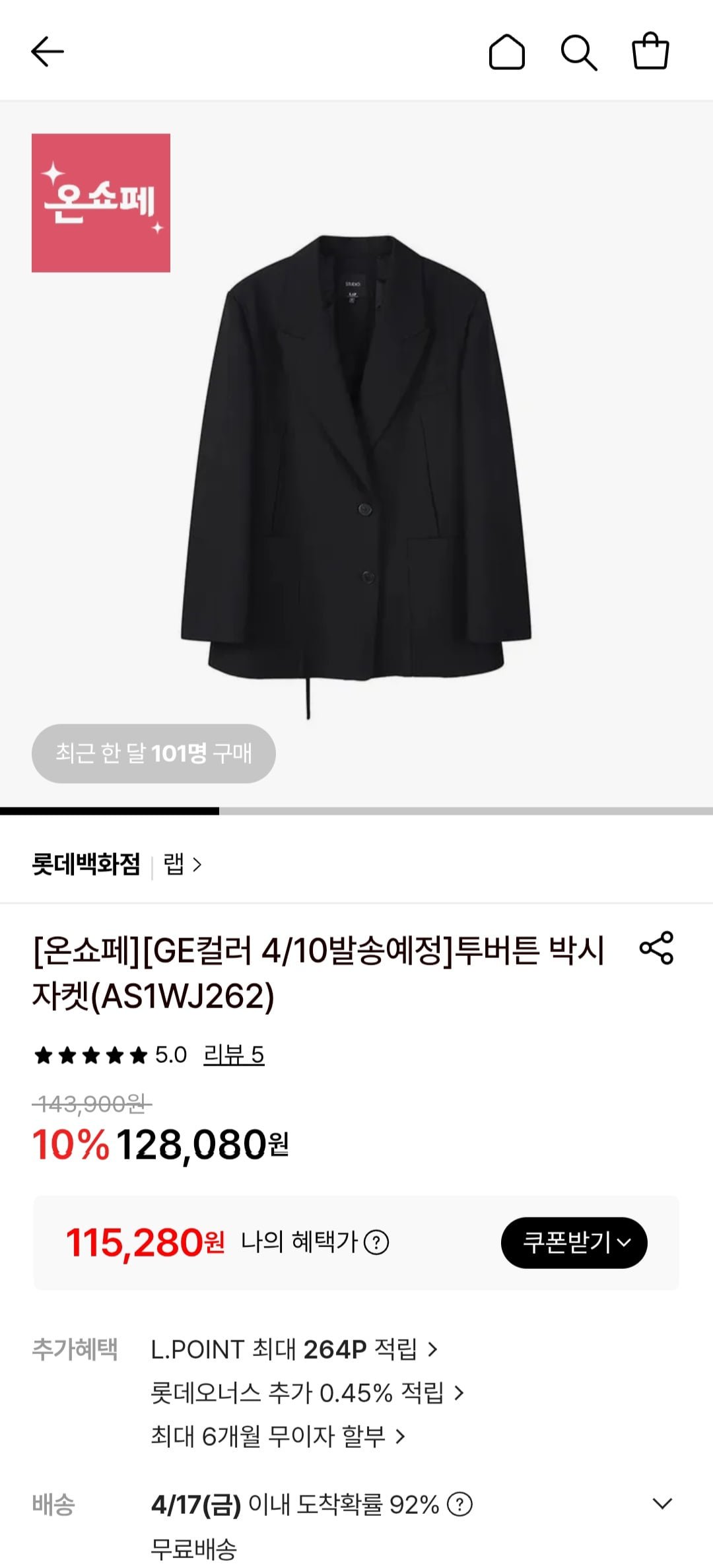 [롯데온]랩 투버튼 박시 자켓 (롯데카드 115,280원/무료)